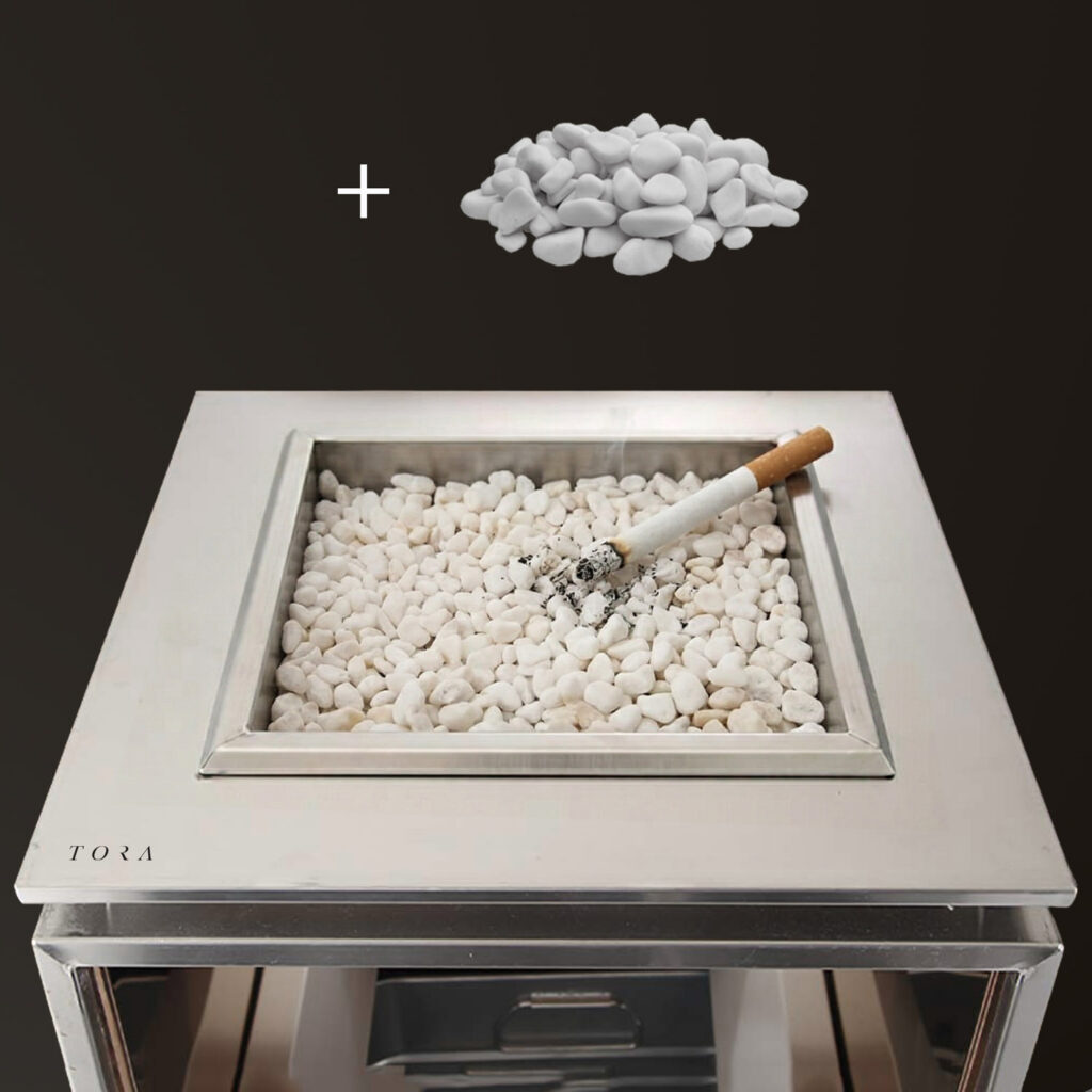 Dodatkowo kosz posiada funkcję popielnicy, do której dołączane są specjalne kamyczki, zwiększające komfort użytkowania oraz poprawiające estetykę. Kamyczki pomagają w gaszeniu niedopałków oraz utrzymaniu czystości, co czyni produkt jeszcze bardziej funkcjonalnym rozwiązaniem do stref dla palaczy.