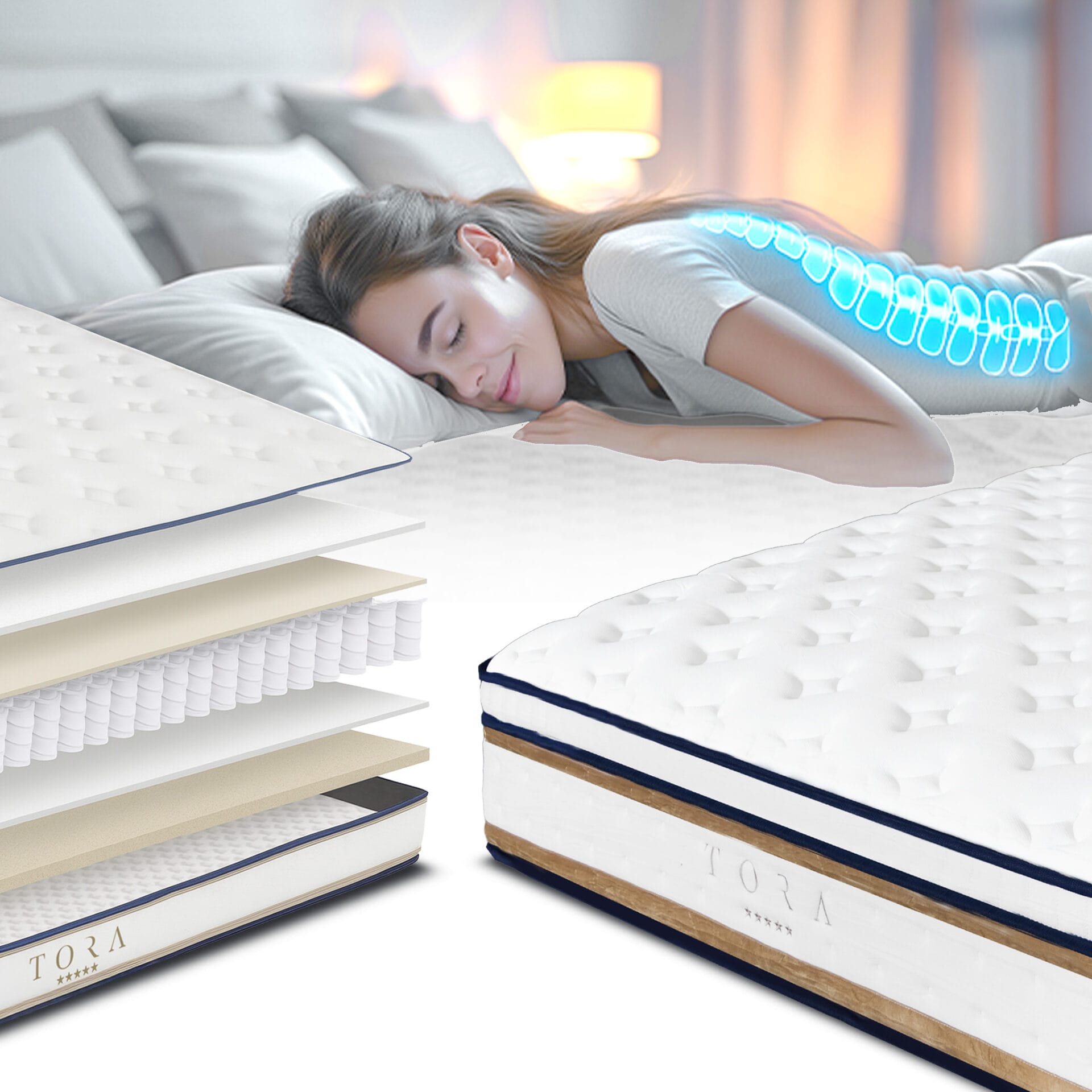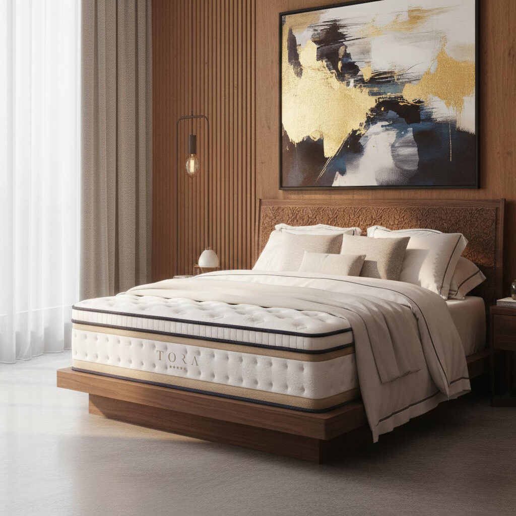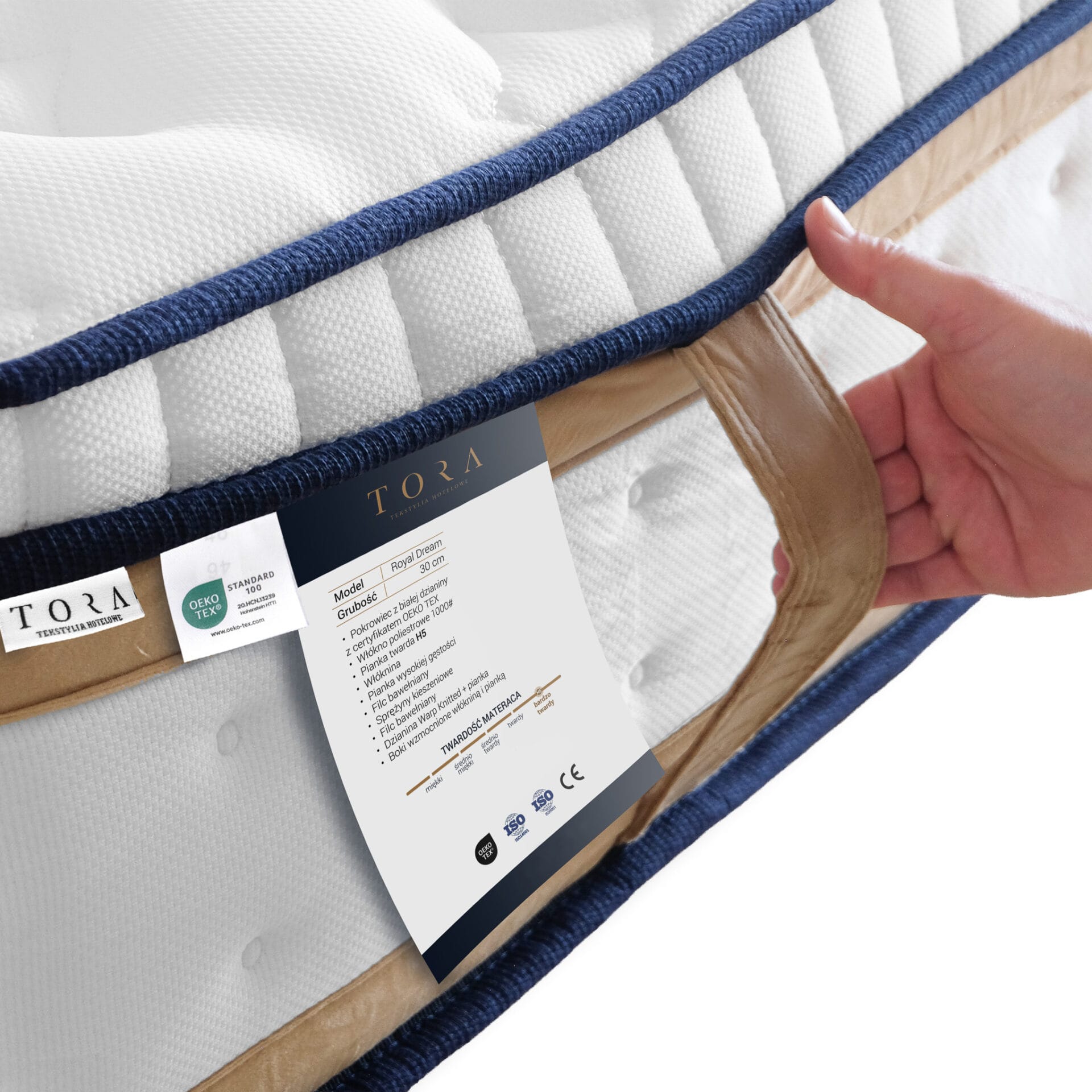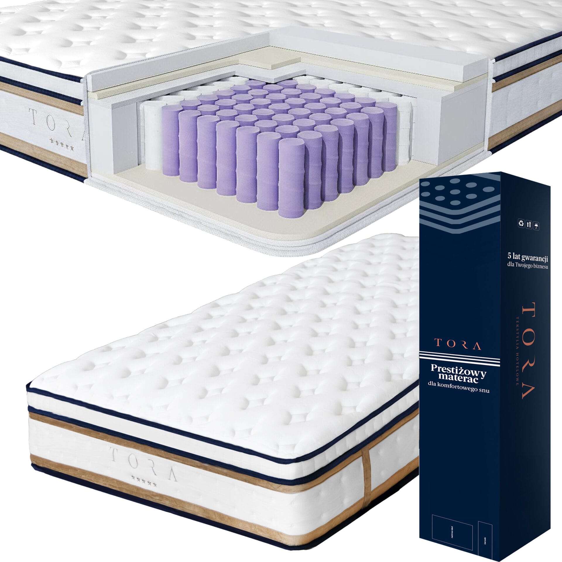Materac Royal Dream ma elegancki, świeży design – biała, pikowana góra z delikatnym wzorem, boki wykończone granatową lamówką i pasem w kolorze złotego beżu oraz subtelne logo TORA. To połączenie klasy i nowoczesności sprawia, że materac świetnie wpisuje się w trend luksusowych, minimalistycznych wnętrz.