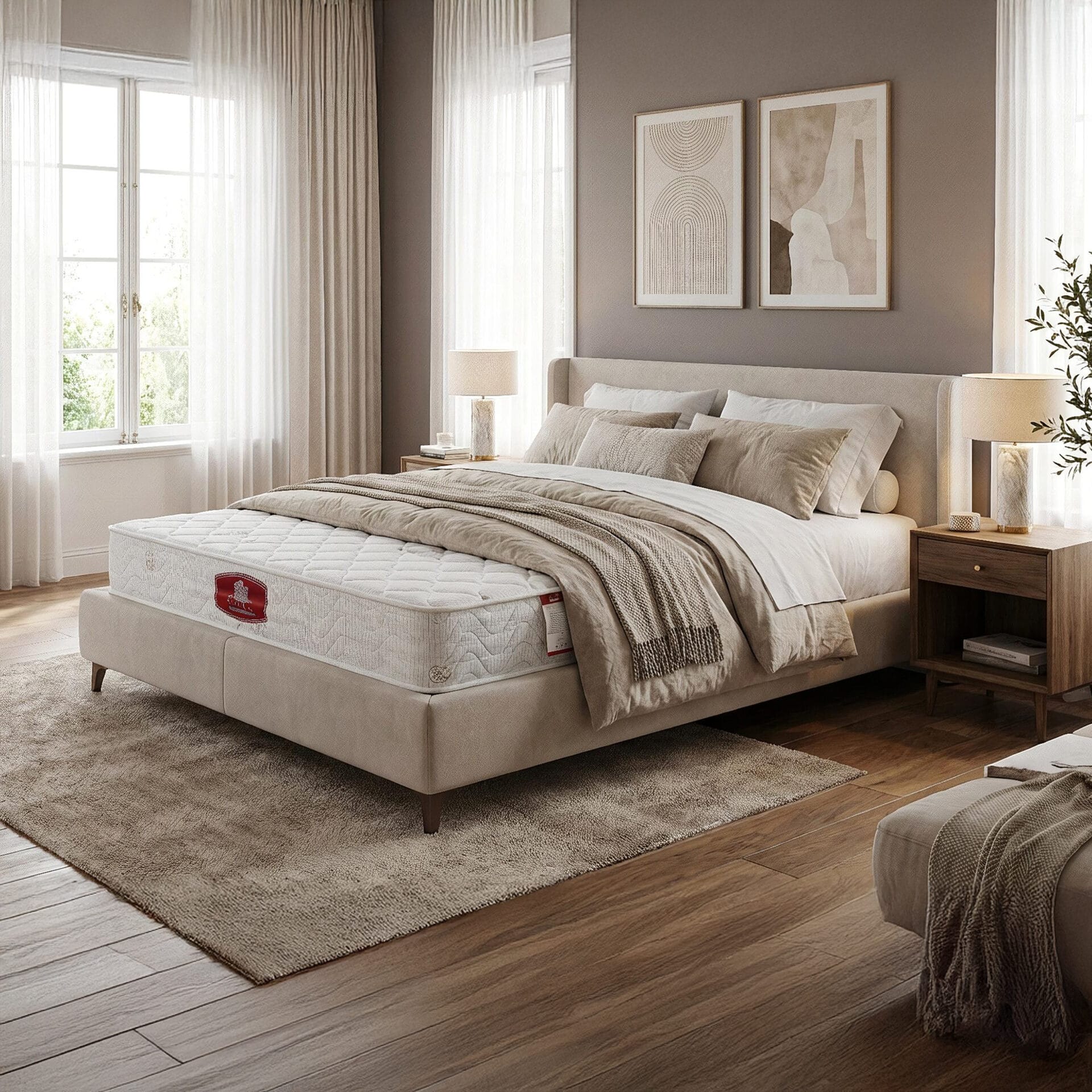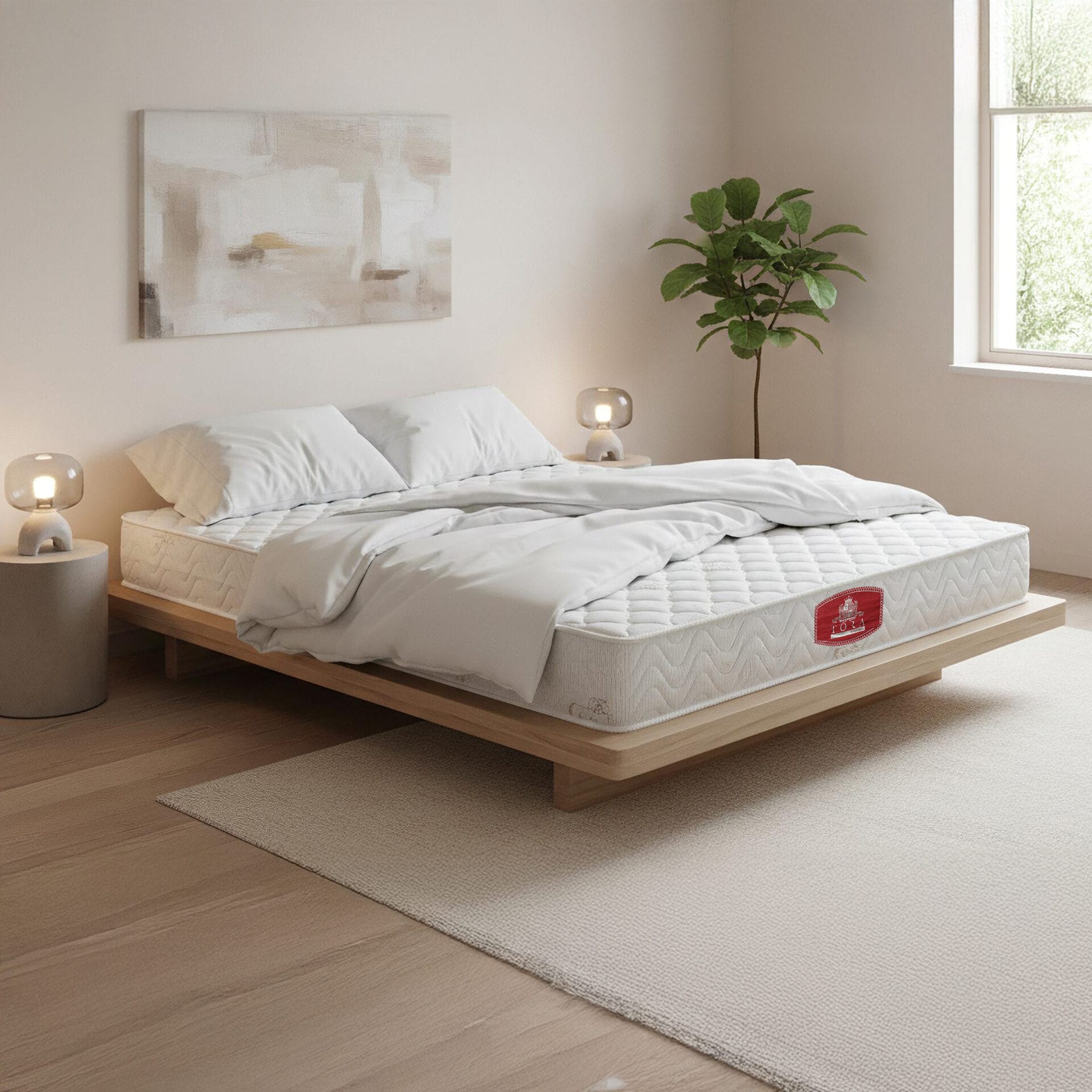 Materac Classic (H4) wyróżnia się eleganckim i solidnym designem – biała, pikowana góra z delikatnym wzorem w romby kontrastuje z bordowo-czarną lamówką wokół boków. Centralne logo TORA dodaje całości klasy i podkreśla dbałość o detale. To stylowy model o wyważonym charakterze, idealnie wpisujący się w estetykę nowoczesnych, hotelowych wnętrz.