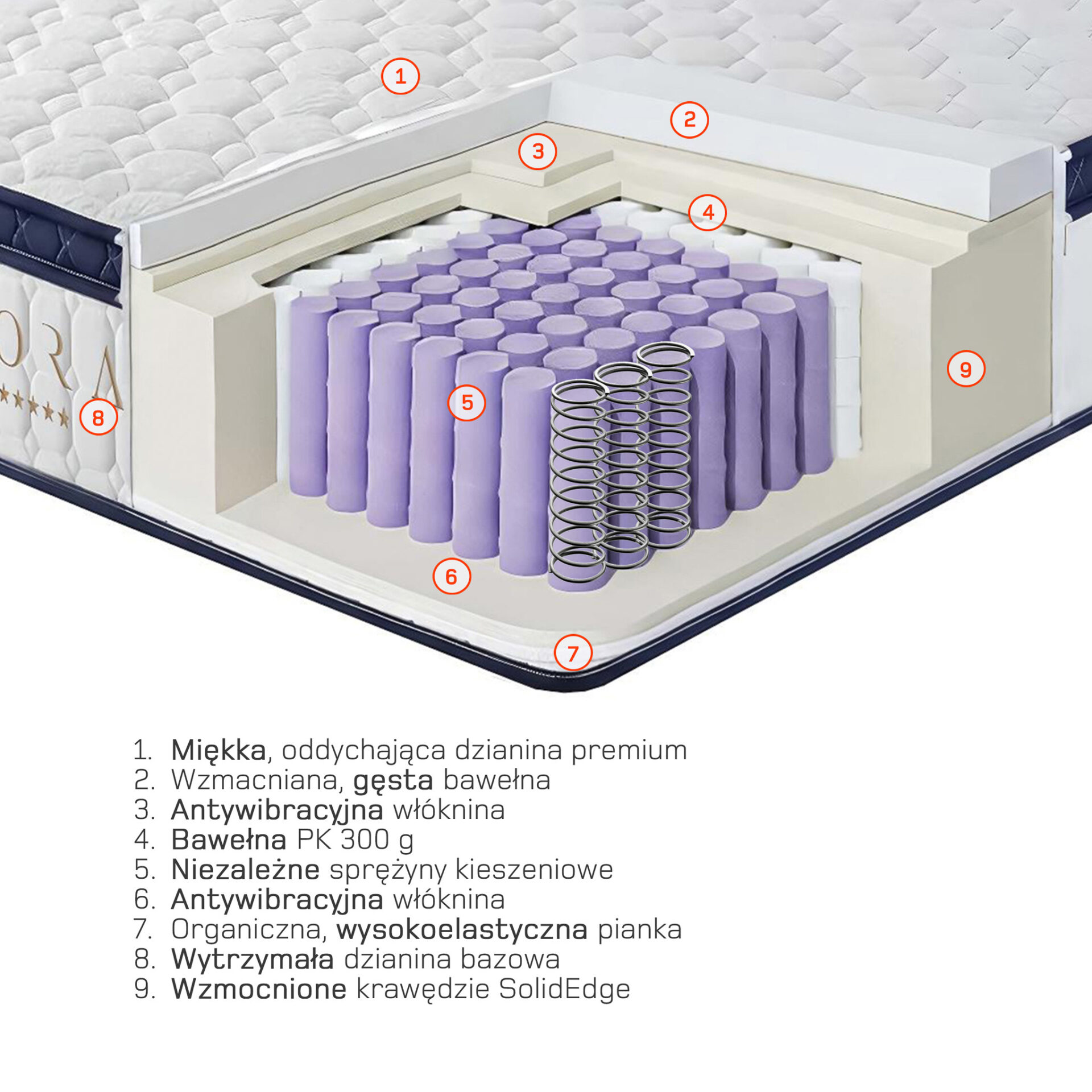 - 7-strefowe sprężyny kieszeniowe – każda sprężyna pracuje niezależnie, zapewniając ergonomiczne podparcie kręgosłupa